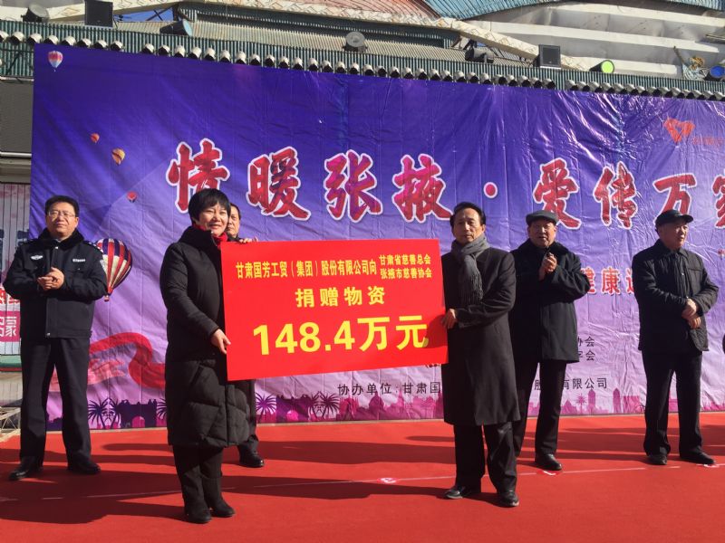 2019年1月11日,甘肅省慈善總會、張掖市慈善協(xié)會、甘州區(qū)慈善協(xié)會以及臨澤縣紅十字會攜甘肅國芳工貿(mào)(集團(tuán))股份有限公司在張掖市中心廣場共同舉行“情暖張掖·愛傳萬家”送健康送溫暖活動,將2000套棉衣,2000余套秋衣秋褲,27臺彩電以及300余件小家電合計價值148萬元的過冬物資帶給山丹縣,民樂縣的困難群眾,將2500個醫(yī)藥箱帶給臨澤縣的老人們。此次活動傳導(dǎo)社會幫扶、精準(zhǔn)扶貧精神的同時也默默為社會傳導(dǎo)著一份正能量。