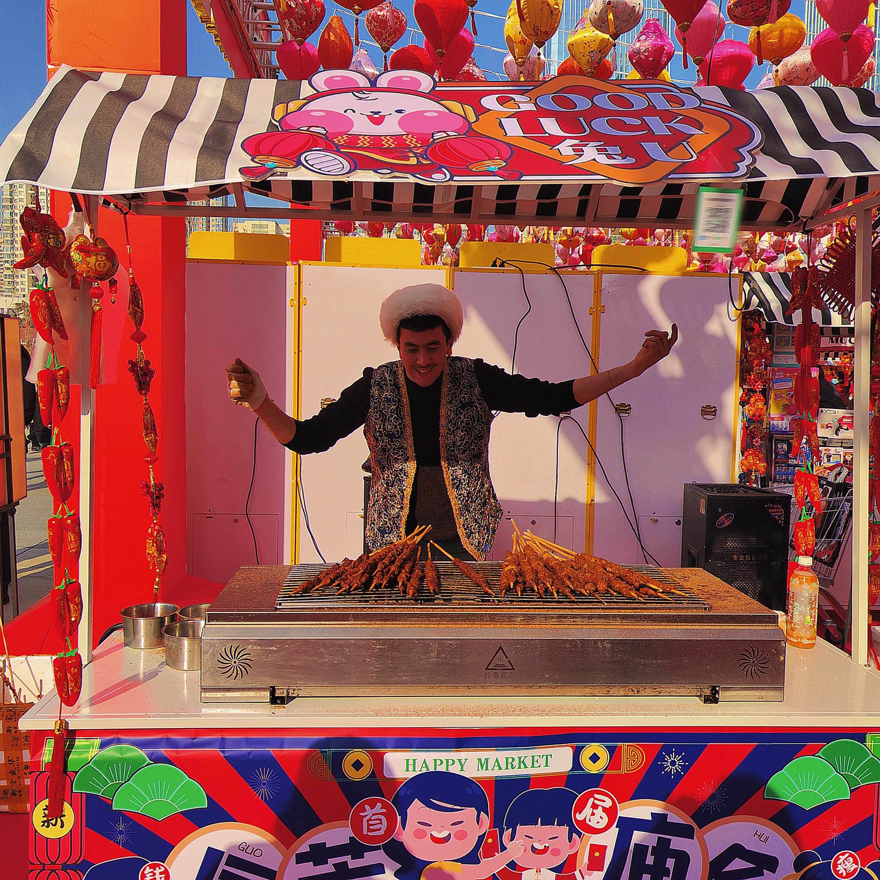 人間煙火處,年味漸濃時(shí)。新疆羊肉串、冰糖葫蘆、臭豆腐、酸辣粉、網(wǎng)紅大面筋,蘭州熱冬果……小吃攤生起騰騰熱氣,飄香十里。